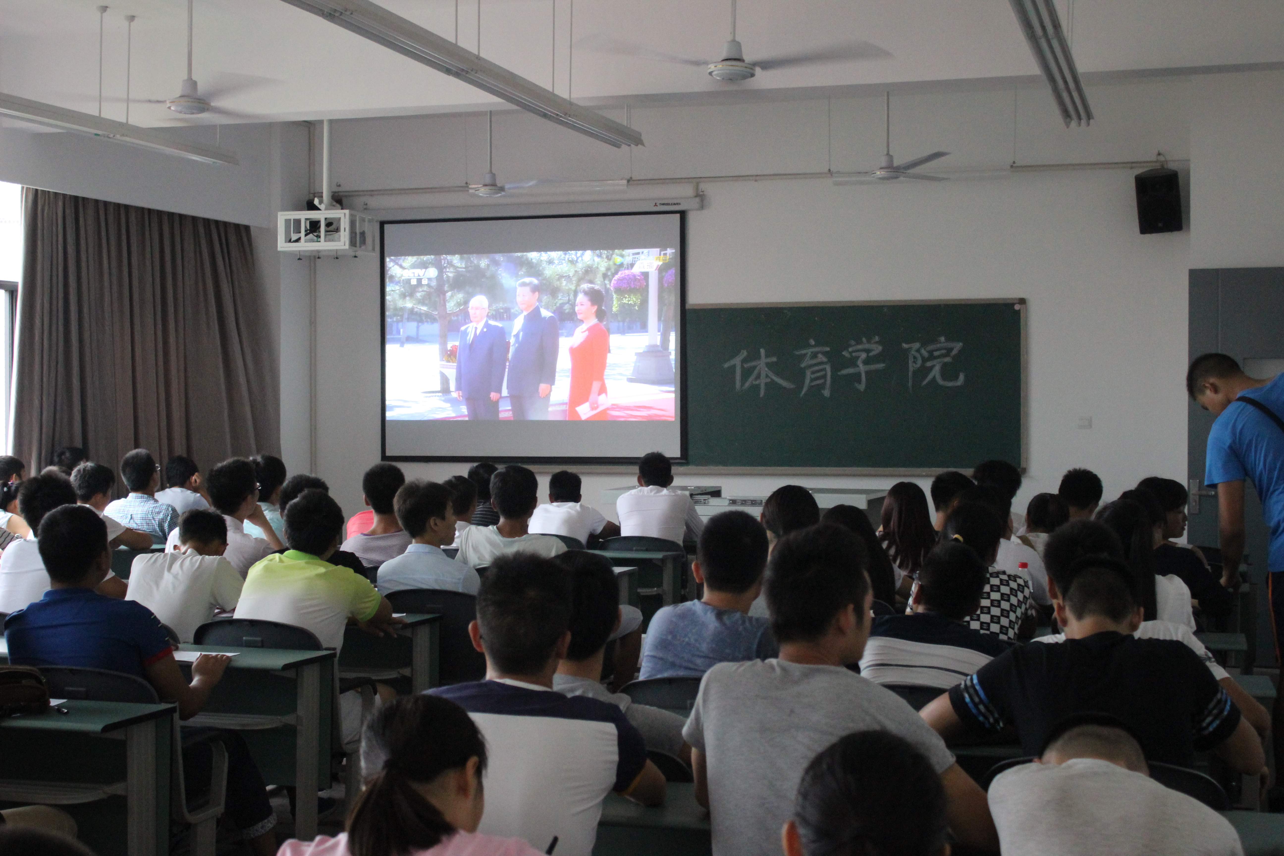 为隆重纪念中国人民抗日战争暨世界反法西斯战争胜利70周年,93日上午,佘涛书记、张皓副书记、李霞和那明明辅导员与300多名学生在传媒楼四楼共同观看了阅兵式直播。