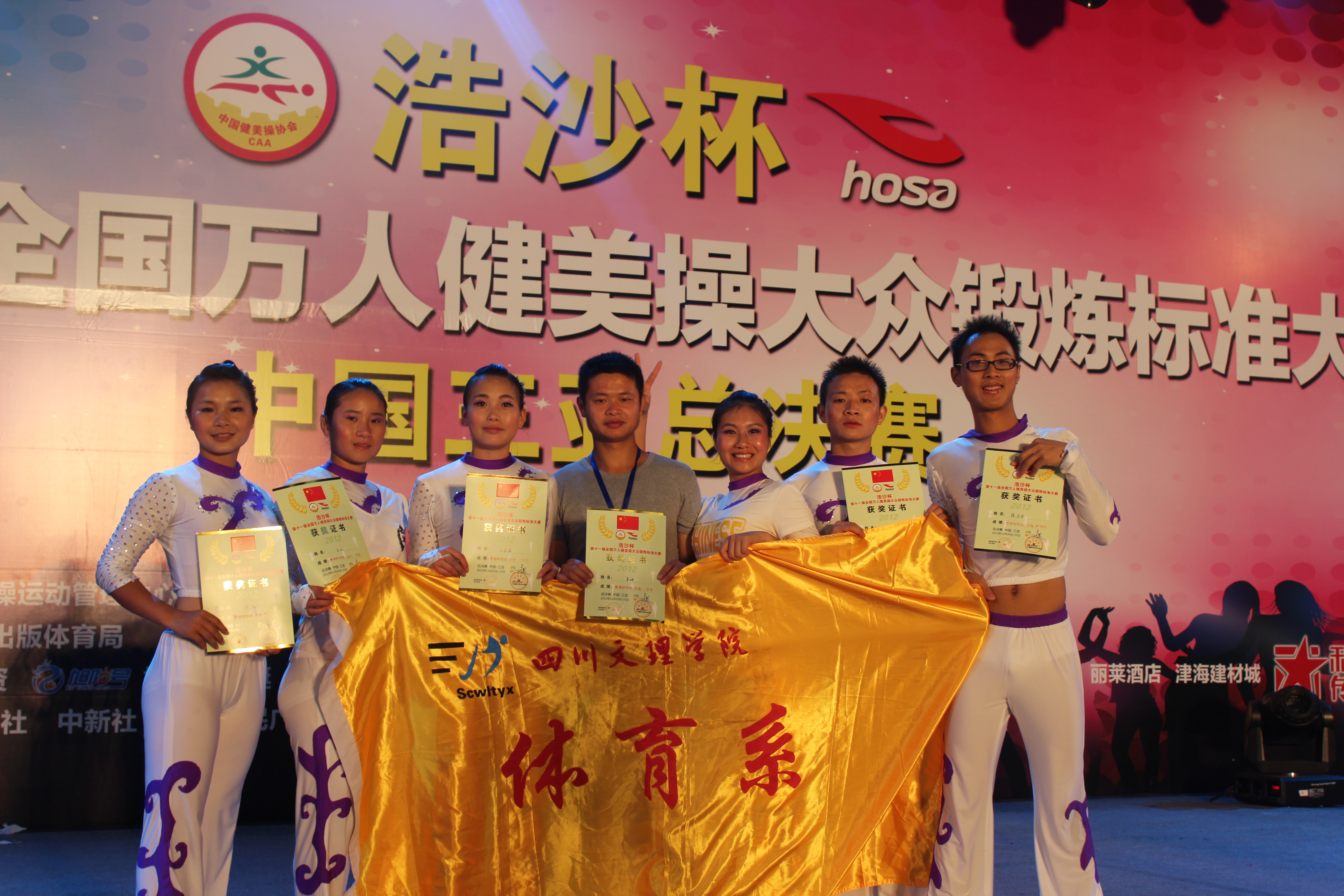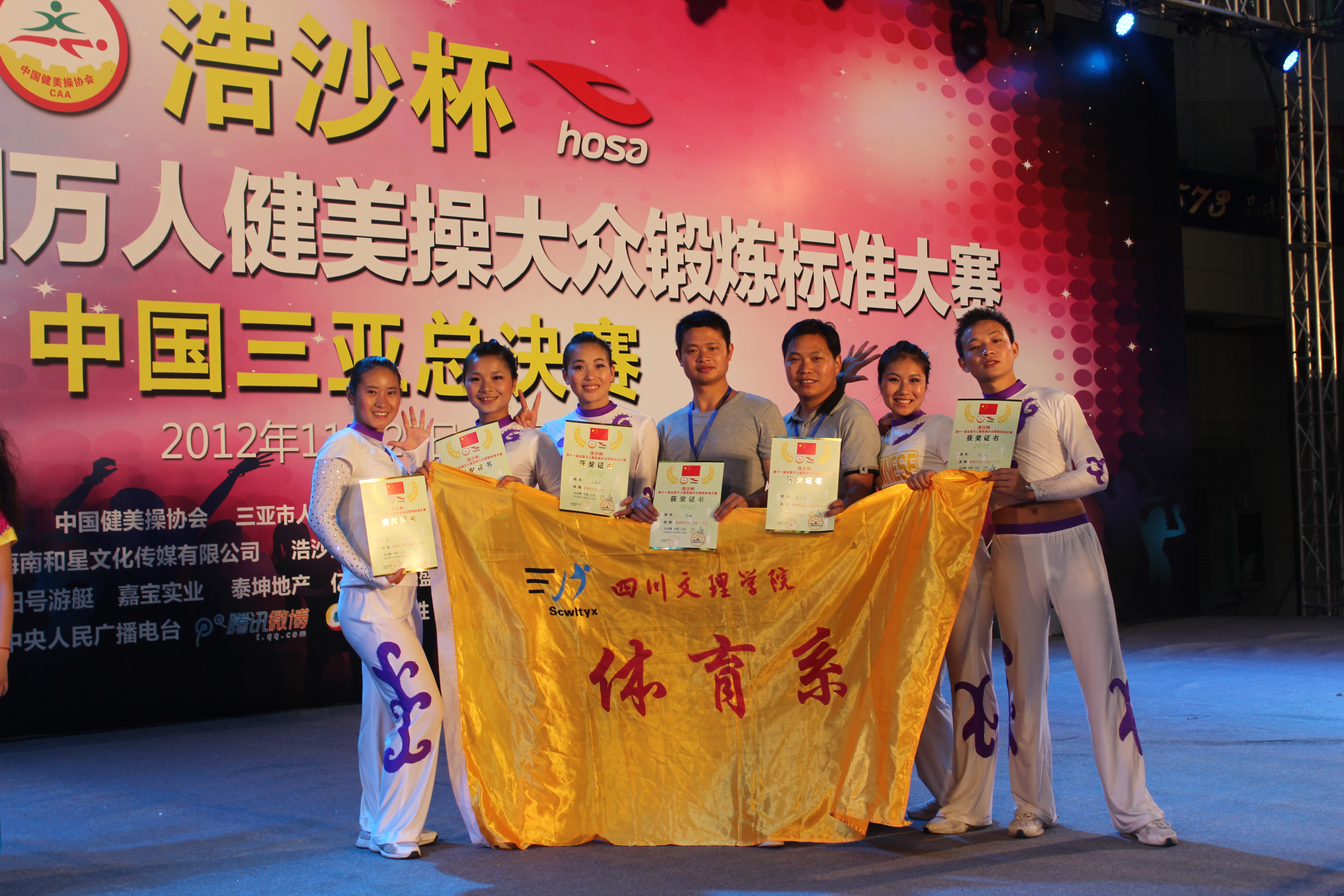 1121至24日,由国家体育总局体操运动管理中心、中国健美操协会主办,浩沙(中国)有限公司、浩沙国际健身管理有限公司承办的2012年“浩沙杯”全国万人健美操大赛总决赛在中国三亚隆重举行,全国来自北京、福建、广东、江西、海南等18个省市约50多支队伍共1000余人参加了此次比赛,十大信誉官网体育系组建的大众五级队在体育系党总支副书记张皓老师及冉卫东教练的带领下参加了本次比赛,并获得了喜人的成绩。