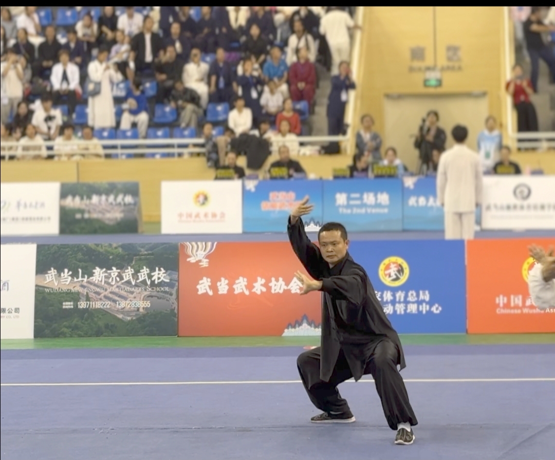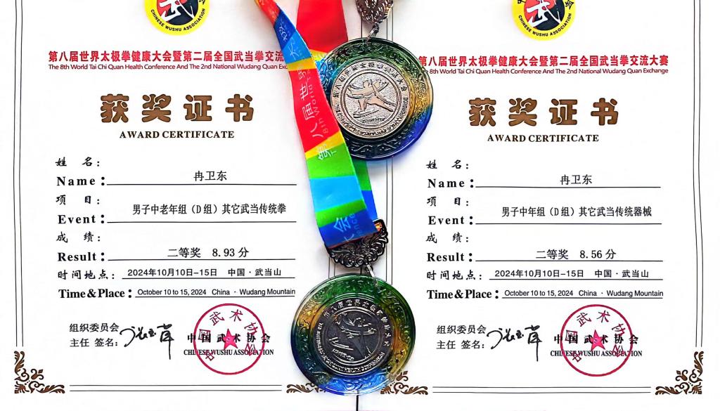 冉卫东老师经过两个多月的刻苦训练,代表学校出征此次大赛。在“一拳一械”个人项目中,凭借出色的表现,其“太乙逍遥掌”和“武当七星剑”双双斩获二等奖,获得两枚银牌。冉老师的逍遥掌,松柔舒缓、连绵不断,尽显太极圆活之美,一招一式精准到位,劲路饱满,展现了太极的刚柔并济;其七星剑表演,剑身灵动而优雅,时而轻缓似清风拂柳,时而凌厉如闪电破空,却又在瞬间收势,淋漓尽致地展现了太极剑的精髓。