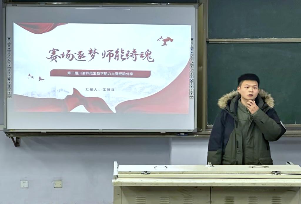 邓程稀以“精研勤练,赛教相长”为题,着重讲解了教材与学情分析、教学流程设计等环节,告诉大家教学过程中教态、语言规范、手势等细节的重要性。江旭日以“赛场逐梦,师能铸魂”为主题,基于国家新课标,详细分享了说课的具体内容及详细流程,结合比赛经历,强调参加竞赛以及高强度的备赛是师范生提升教学能力的重要途径。